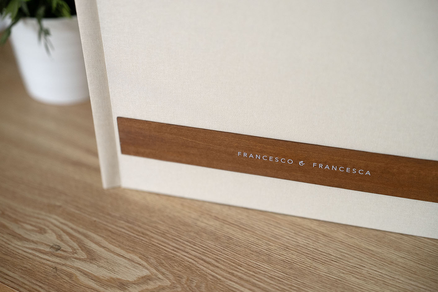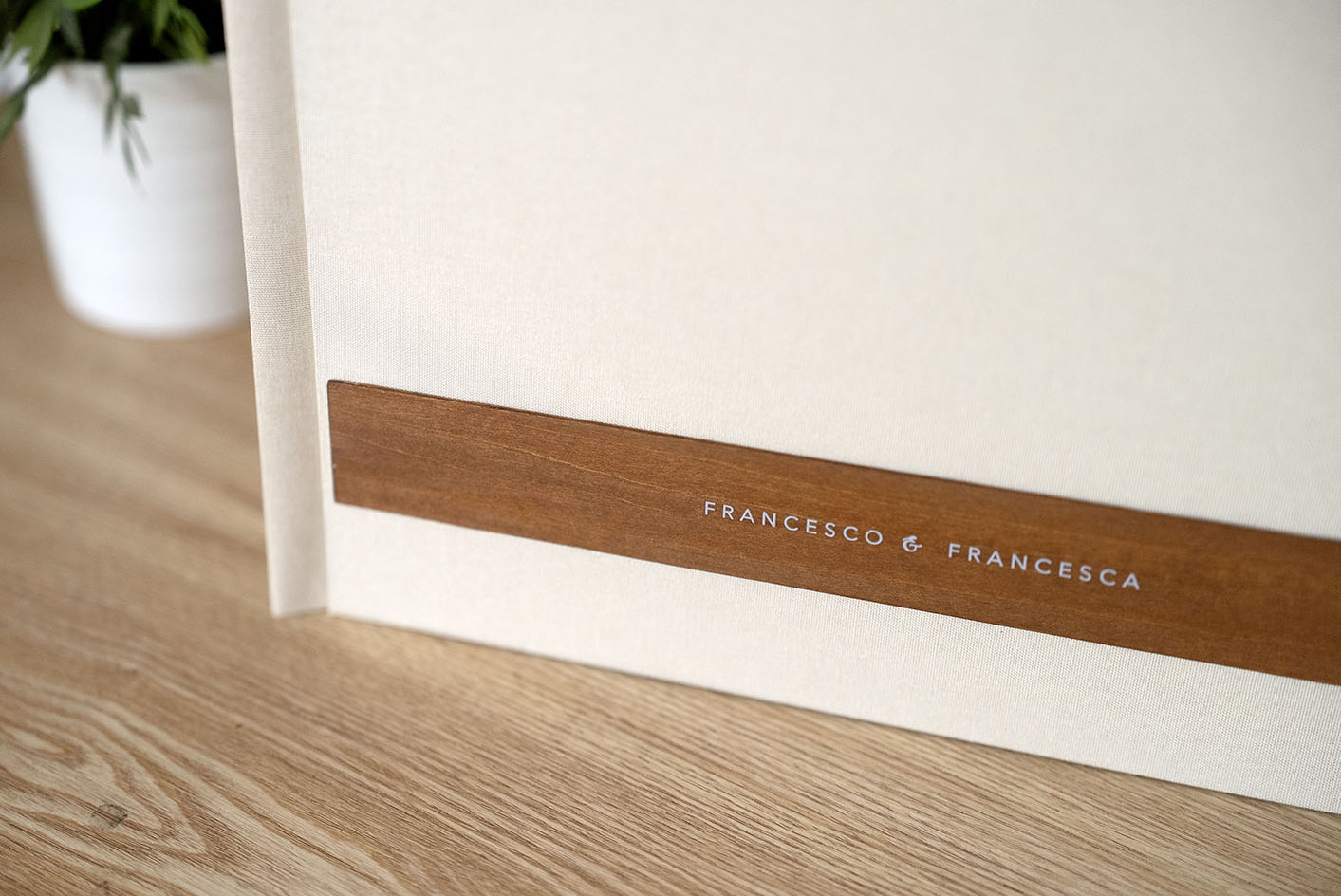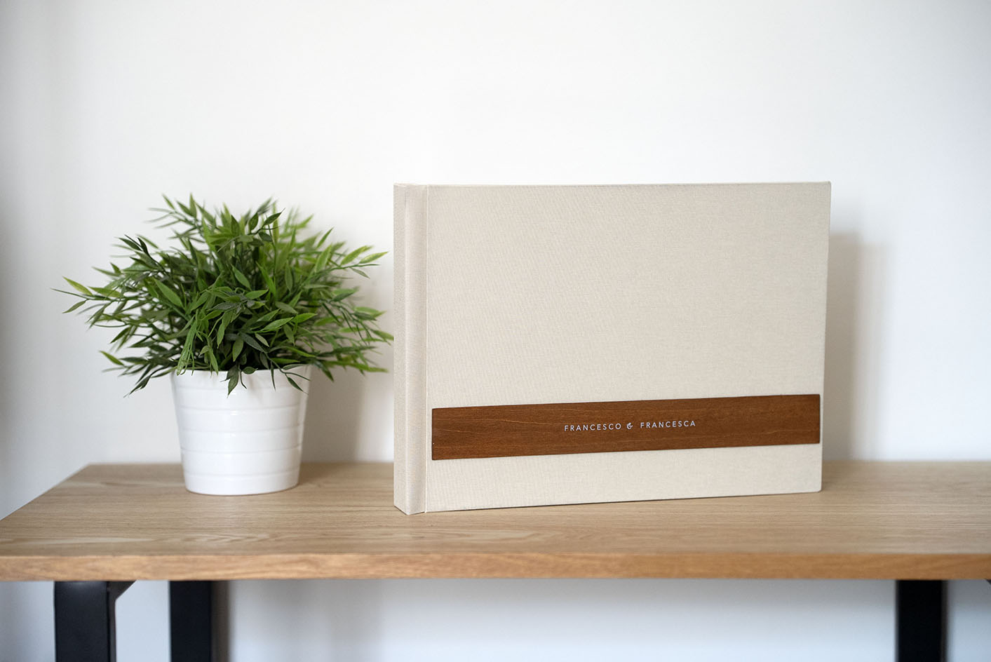 Album fotografico artigianale modello Deneb: copertina proposto in tessuto chiaro (personalizzabile) con in basso una decorazione con legno tinto noce. Personalizzazione con stampa UV inclusa.