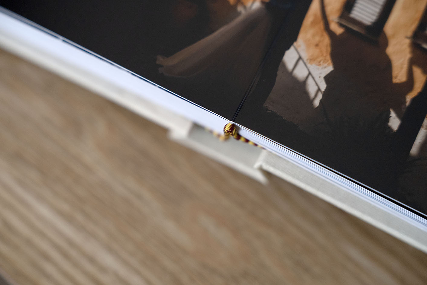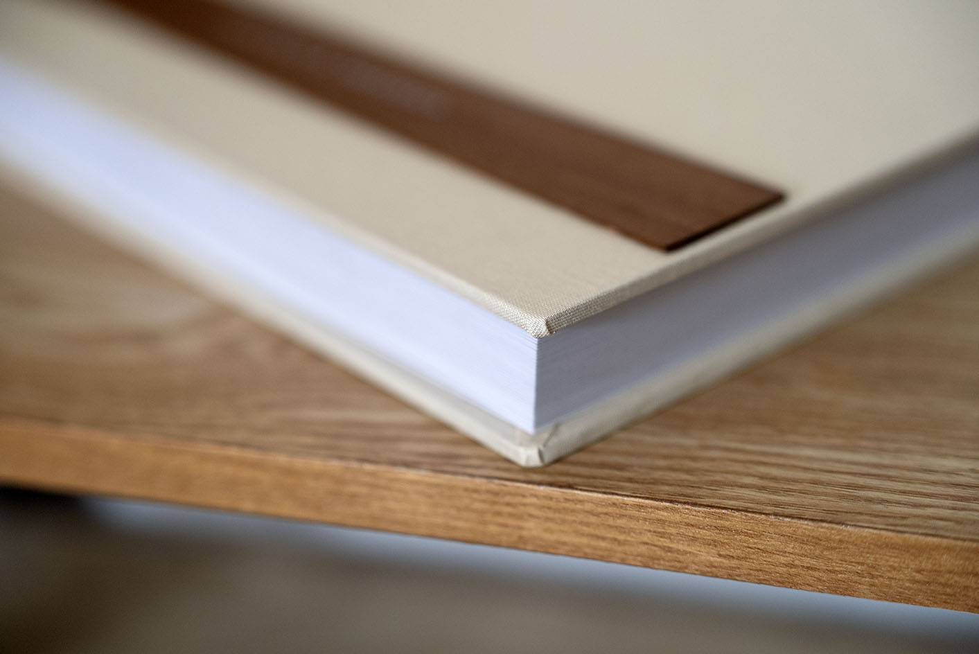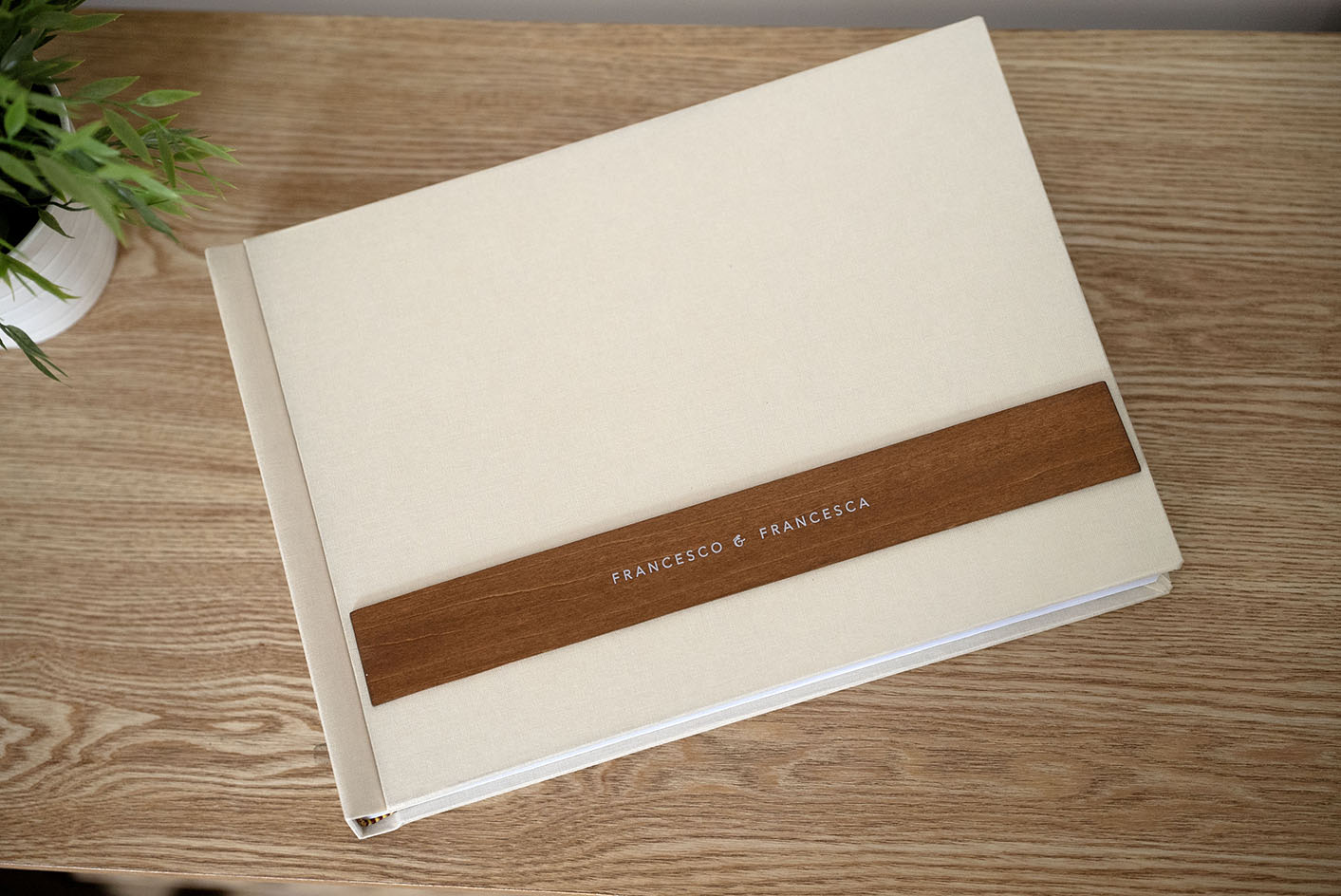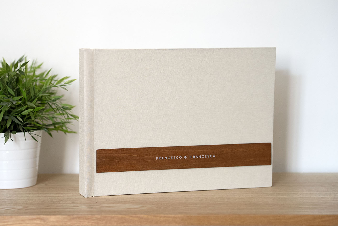 Album fotografico artigianale modello Deneb: copertina proposto in tessuto chiaro (personalizzabile) con in basso una decorazione con legno tinto noce. Personalizzazione con stampa UV inclusa.