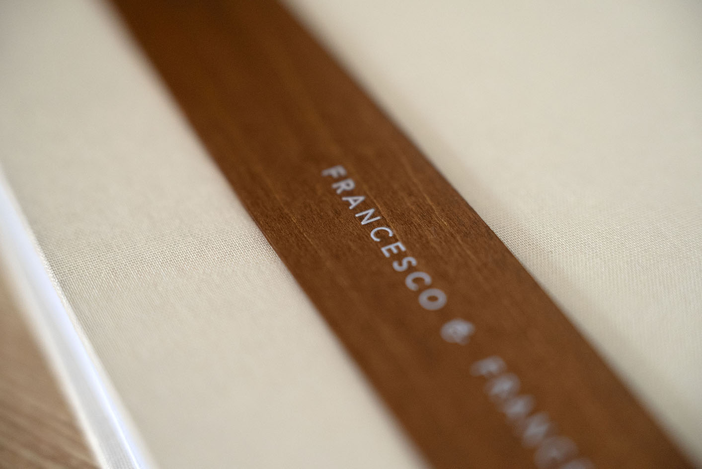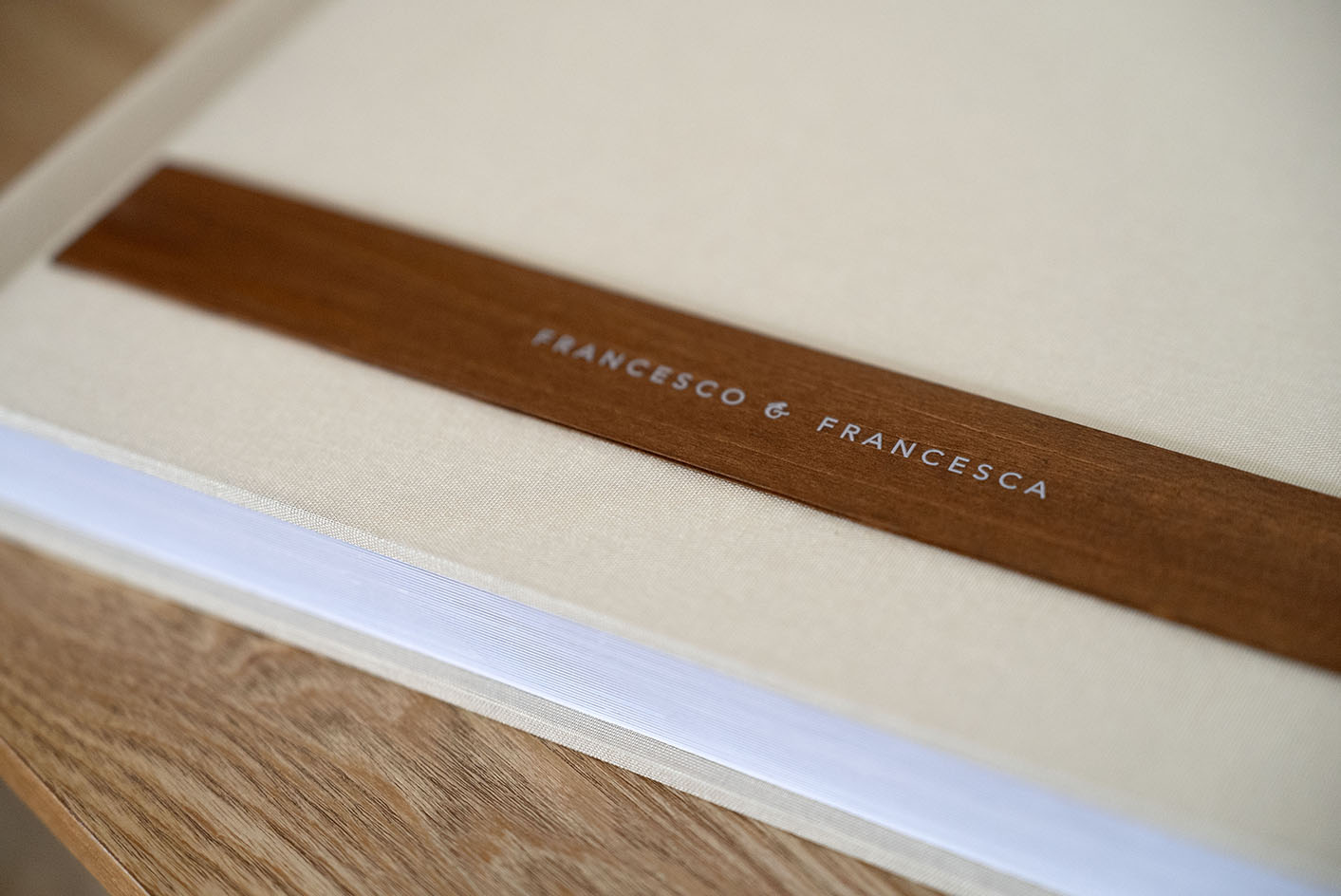 La copertina è qui proposta con tessuto chiaro e una placca in legno dove è possibile inserire la personalizzazione dei nomi.