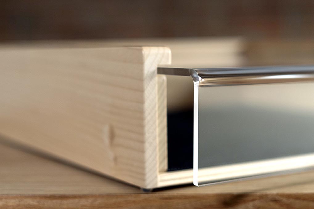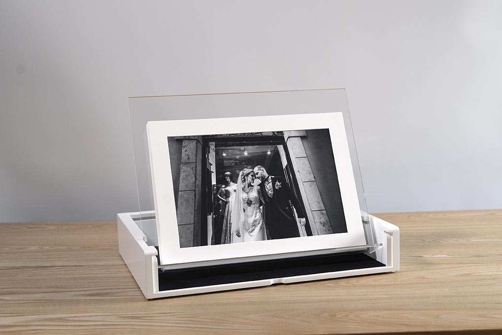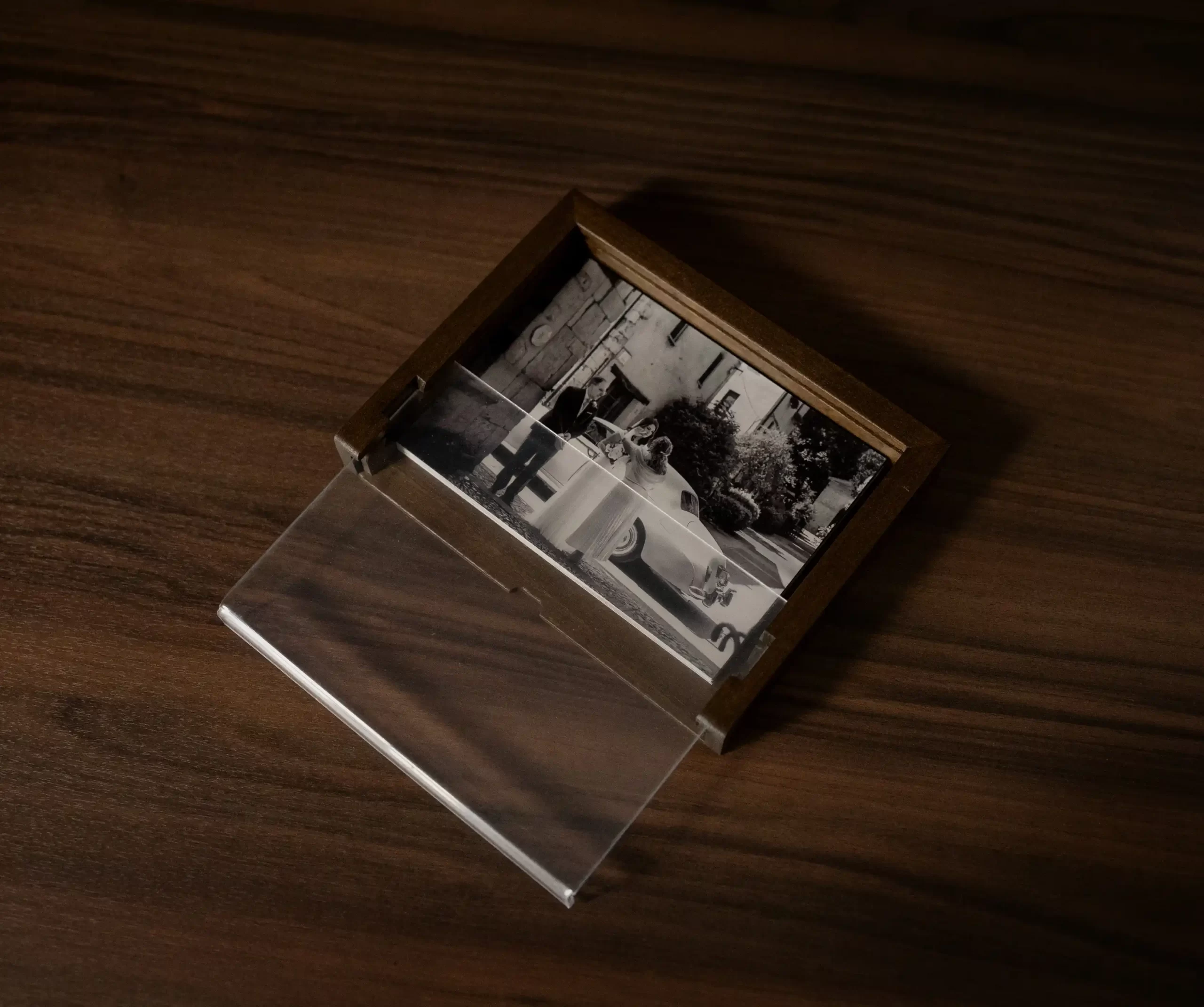 Realizzata artigianalmente in plexiglass trasparente e legno di alta qualità, la Slidebox è progettata per contenere, proteggere ed esporre i tuoi album o le tue stampe fotografiche con eleganza.