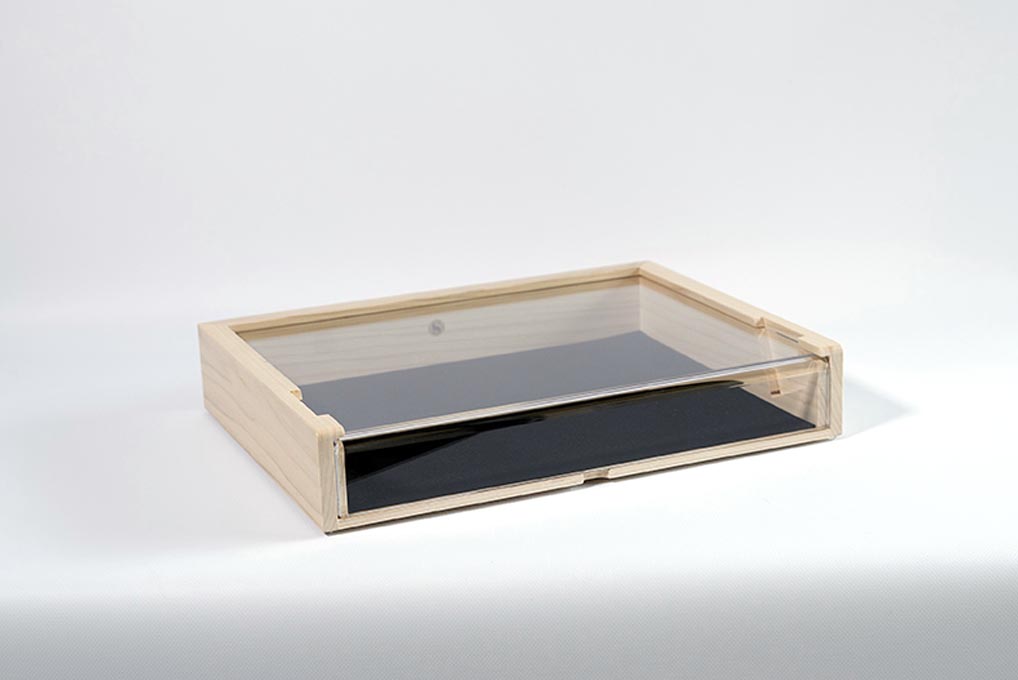 La Slidebox è una teca elegante in plexiglass e legno che si trasforma in un leggio da esposizione. Perfetta per album e stampe, disponibile in 5 formati e 3 finiture: bianco, noce e naturale.